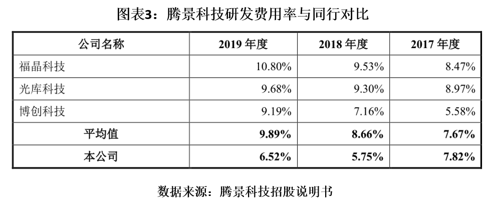 与腾景科技的保守相比,同行却在不断加大研发投入力度。招股书显示,2017—2019年,同行可比公司的研发费用率均值分别为7.67%、8.66%、9.89%,同行的研发投入力度不断加大。随着我国发展进入新阶段,研发已是非常重要驱动引擎,腾景科技的研发费用率从领先到落后,背后体现出的是其研发重视程度不足,不排除后续在技术上被同行拉开差距从而掉队的可能性。