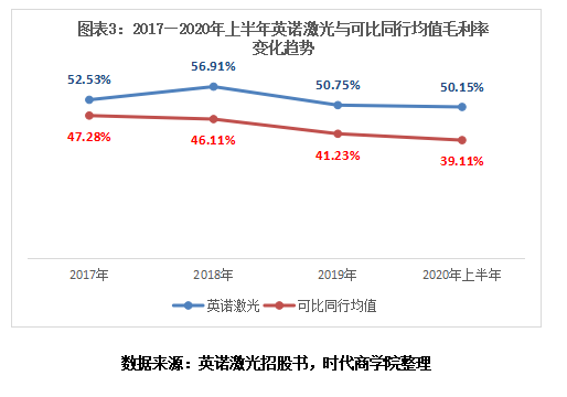 招股书显示,2017年、2018年、2019年和2020年1—6月,英诺激光的综合毛利率分别为52.53%、56.91%、50.75%和50.15%,可比同行的毛利率均值分别为47.28%、46.11%、41.23%和39.11%。