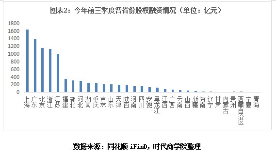 从省份看,据同花顺iFinD统计,今年前三季度,沪深市场股权融资排名前十省份分别为上海、广东、北京、浙江、江苏、福建、湖北、河北、湖南、重庆,融资金额分别为1641.38亿元、1400.96亿元、1160.6亿元、1134.12亿元、1005.21亿元、353.17亿元、316.22亿元、298.39亿元、255.05亿元、250.49亿元。