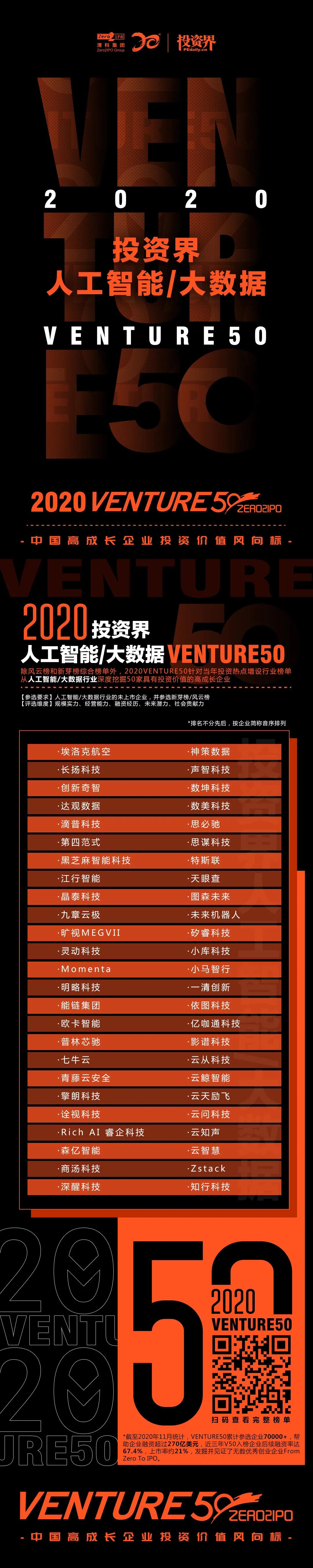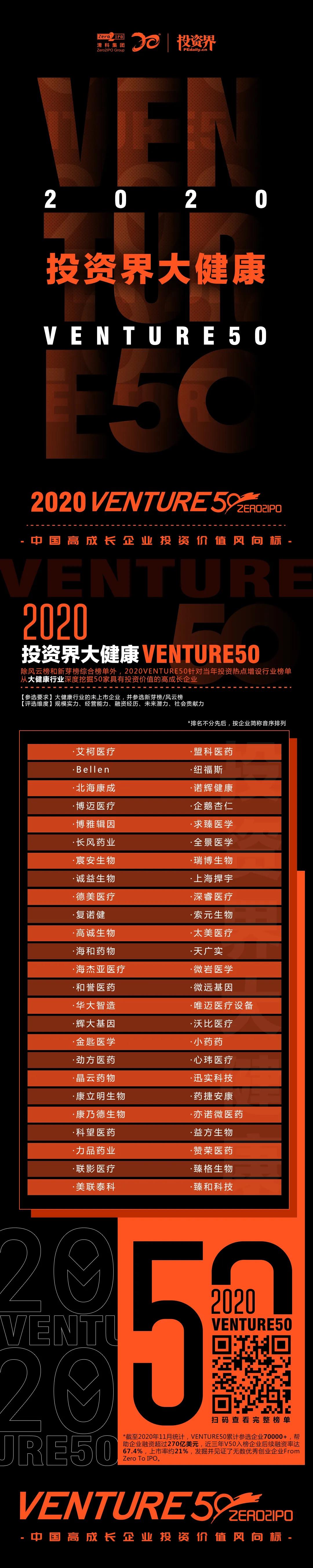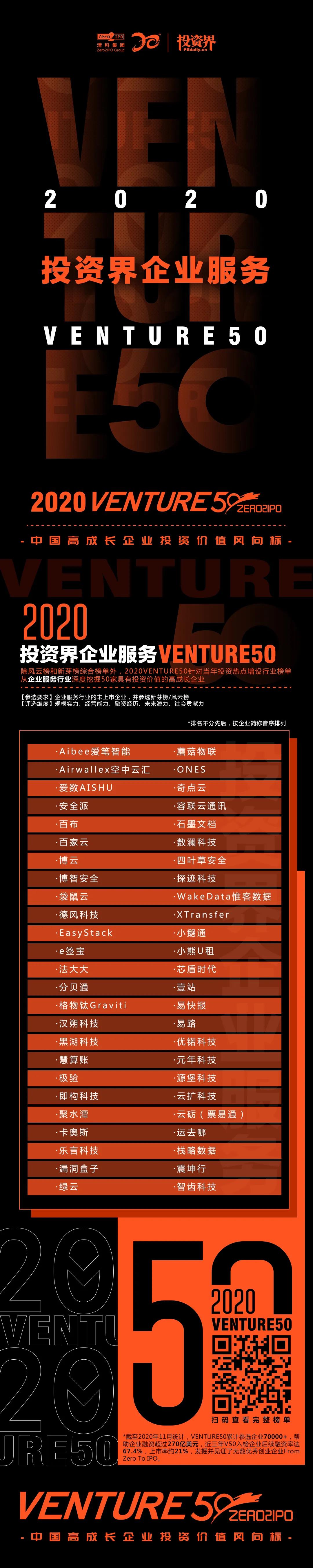 Venture50(简称V50),由清科集团自2006年创办至今。历经十余年的发展与升华,本评选已成为高成长企业投资风向标。并针对企业不同发展阶段,设立风云榜和新芽榜,聚集万家创业项目、邀数百家投资机构、逾千位投资人评审,为创业企业和投资机构打造多维互动平台,为众多创业项目带来资本助力。2020年增设五大行业榜单,从行业维度深度发掘具有行业风向标意义的未上市领军企业,带动资本对高成长企业的关注与发掘。
