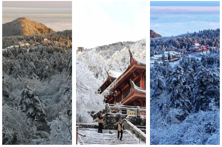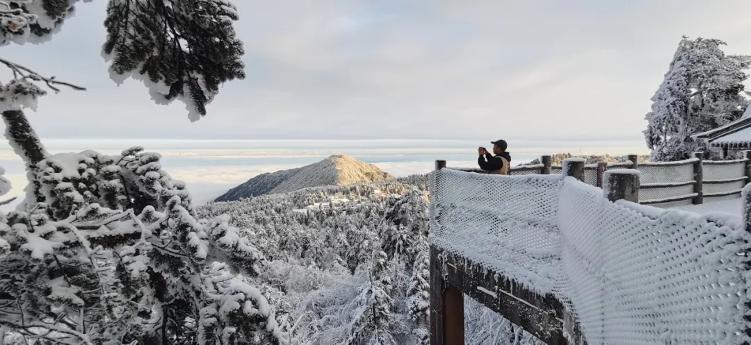 冬日的暖阳洒在山上,银装素裹的仙山在金光点缀下分外迷人。从山脚至山顶,雪慢慢浸润,凝聚到路面、树梢、屋檐,金顶,争相前往一窥南国冰雪。