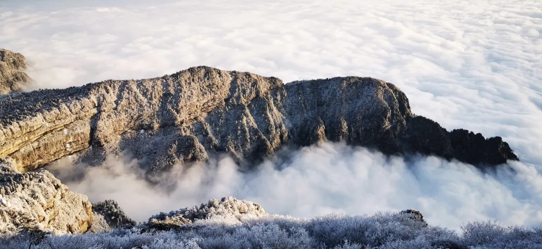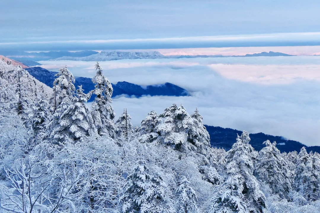 冬日的峨眉仙山,云蒸霞蔚之势更胜,日出之景更加磅礴,搭配雪山林海入镜。千树万树“梨花开”,氤氲的雾气模糊了山和树的界限,每个落脚点都是一副风景画。