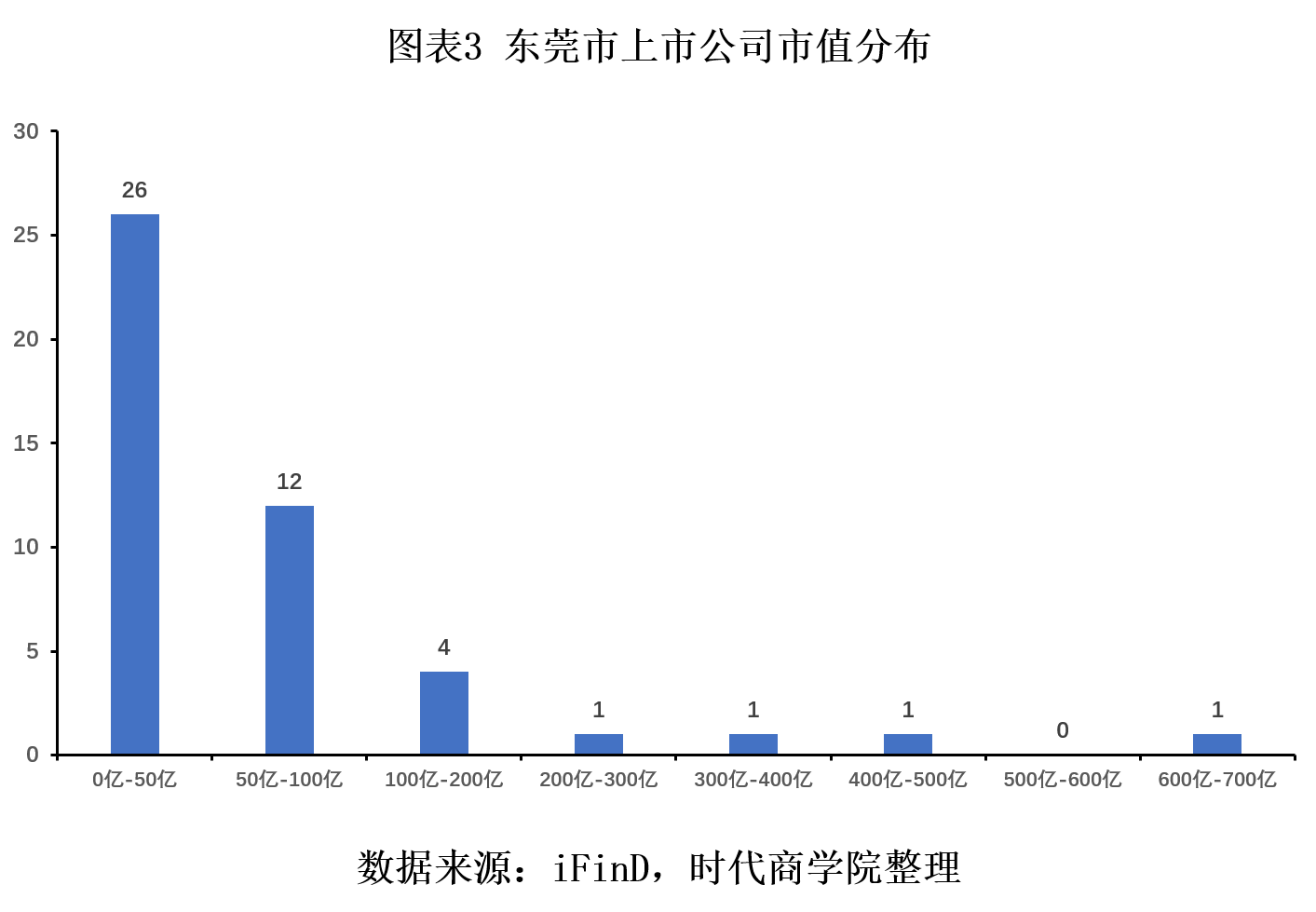 东莞市上市公司市值主要分布在50亿元以下、50亿—100亿元区间,分别有26家、12家上市公司市值属于这两个区间。换言之,总计38家公司市值低于100亿元,数量占比超8成。