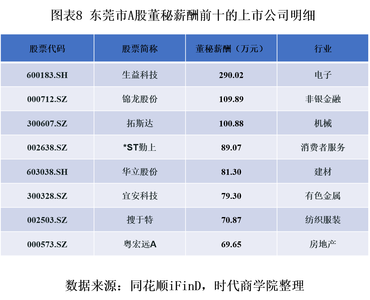 2019年,东莞A股上市公司的董秘平均年薪为58.6万元,中位数为49.12万元。其中,董秘薪酬前三名的A股上市公司分别为生益科技(290.02万元)、锦龙股份(109.89万元)、拓斯达(100.88万元)。