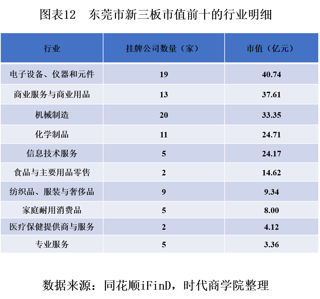 从挂牌企业市值看,东莞新三板挂牌企业市值排名前四的行业分别是电子设备、仪器和元件、商业服务与商业用品、机械制造、化学制品。