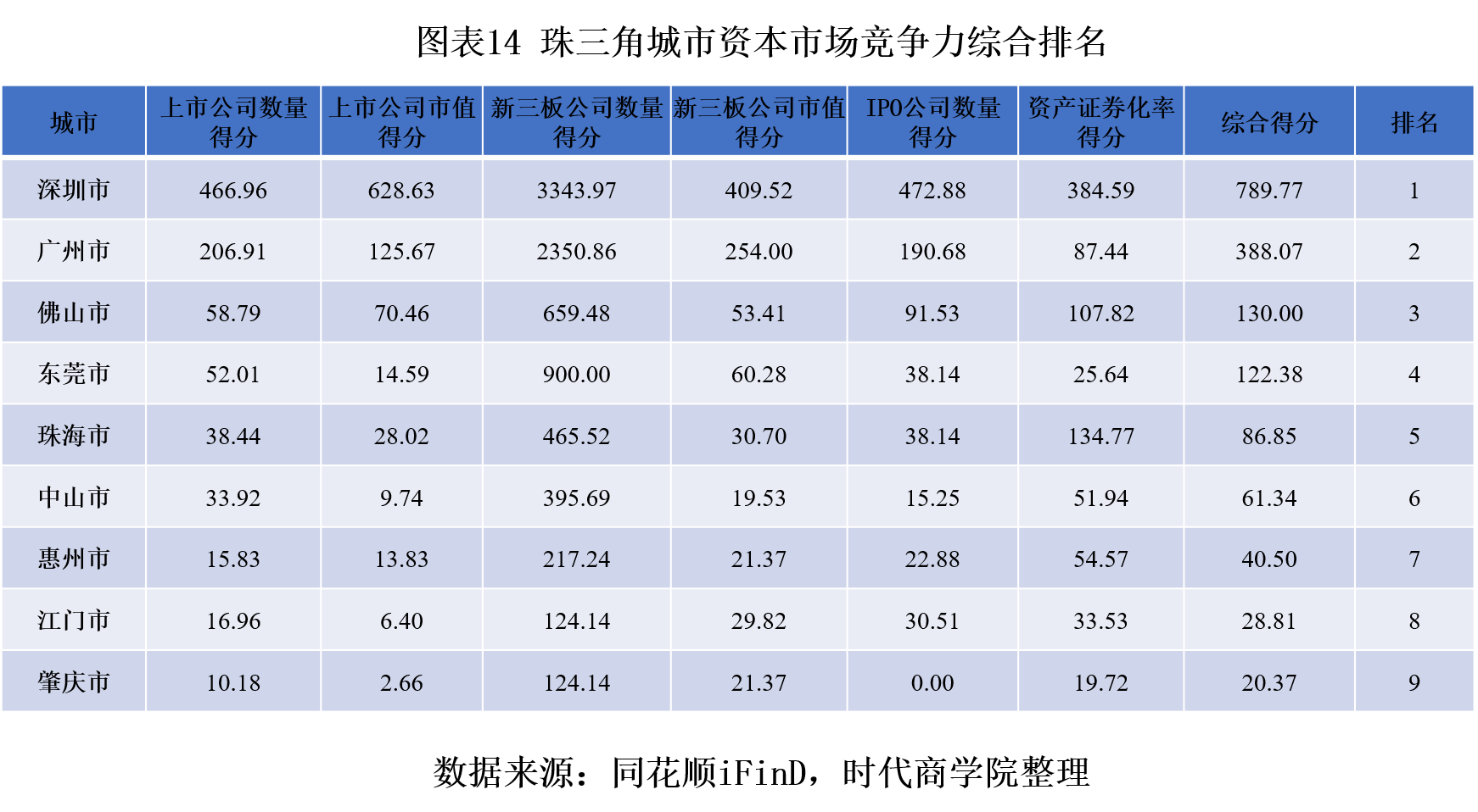 时代商学院以上市公司数量、上市公司市值、IPO企业数量、新三板挂牌企业数量、新三板企业市值等指标来衡量城市的资本市场竞争力,分别给予以上指标30%、30%、10%、10%、10%、10%的权重,以各个指标的平均值作为基数(100),得出单项得分,随后乘以各自权重,加总得到综合得分,依此分析得出珠三角城市的资本市场竞争力。