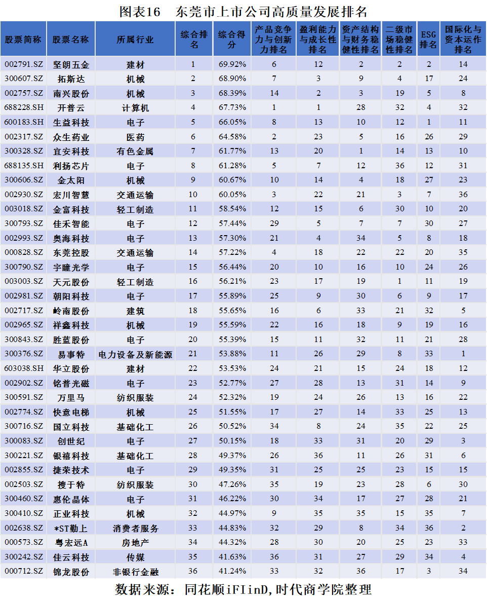 与此同时,时代商学院还基于公司经营角度,从产品竞争力与创新力、盈利能力与成长性、资本结构与财务稳健性、ESG、国际化与资本运作等维度对东莞市上市公司的发展质量进行评估和排名,以此度量当地上市公司整体发展状况。