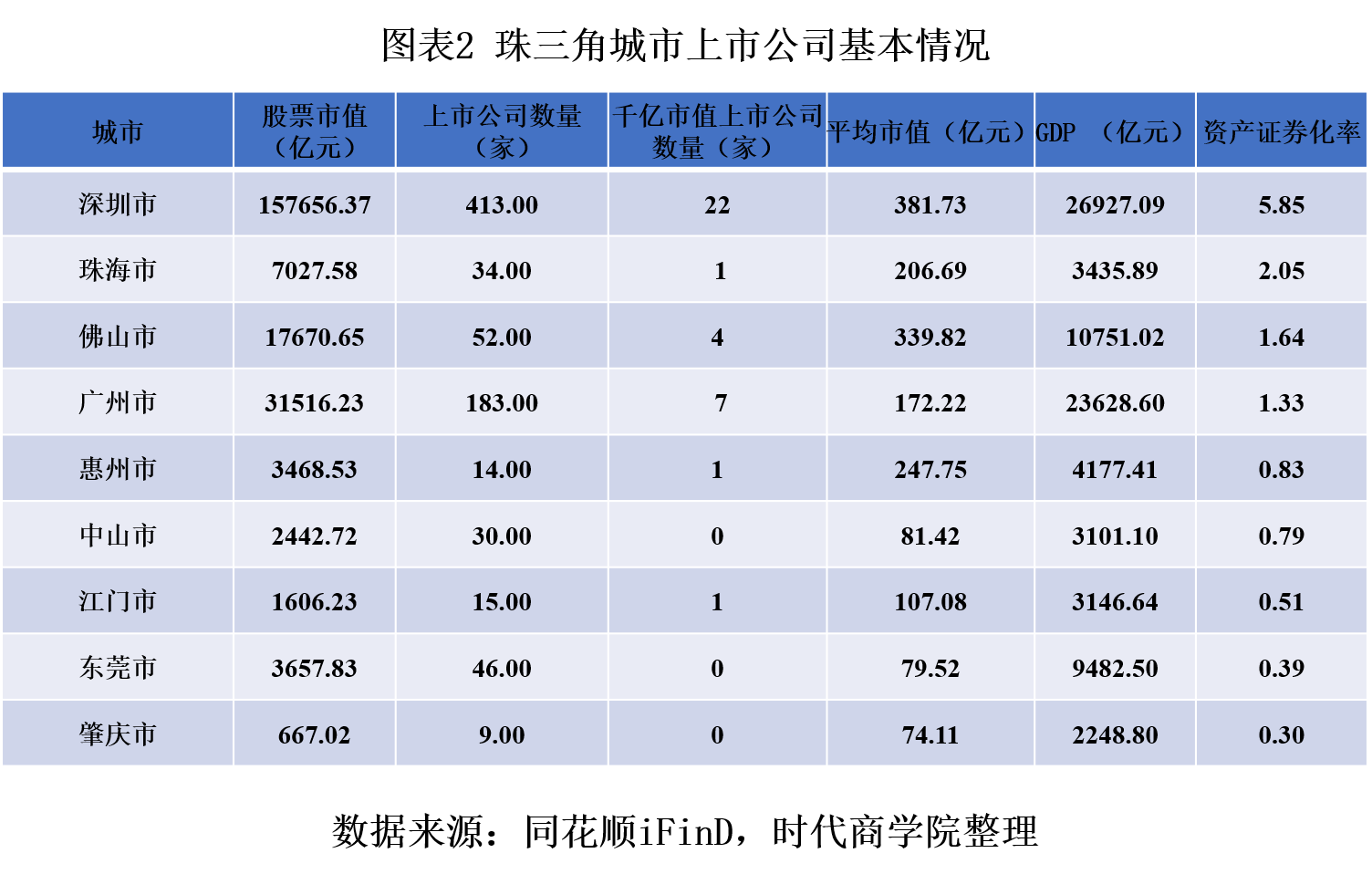 时代商学院以上市公司数量、上市公司市值、IPO企业数量、新三板挂牌企业数量、新三板企业市值等指标来衡量城市的资本市场竞争力,分别给予以上指标30%、30%、10%、10%、10%、10%的权重,以各个指标的平均值作为基数(100),得出单项得分,随后乘以各自权重,加总得到综合得分,依此分析得出珠三角城市的资本市场竞争力。