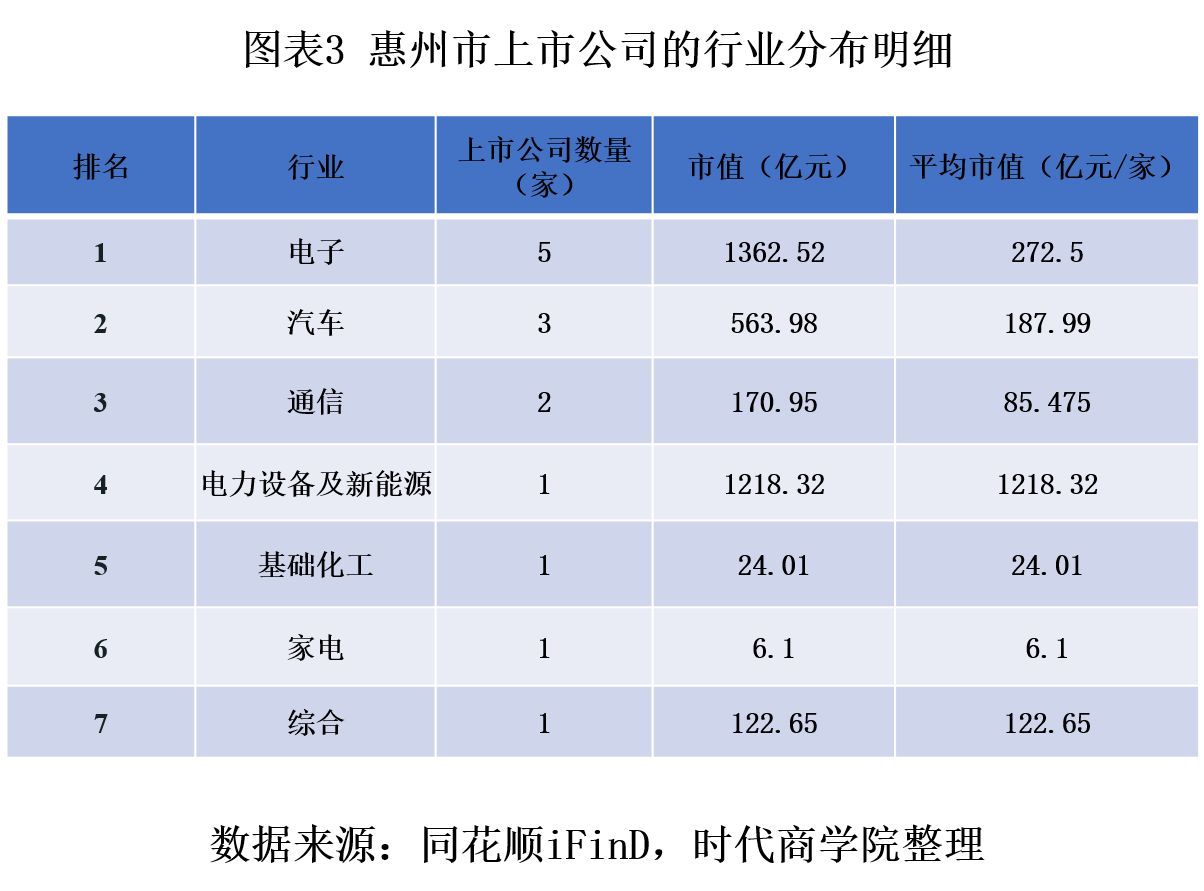 从惠州市上市公司的行业结构看,电子、汽车、通信行业在上市公司数量方面排名前三,电子、电力设备及新能源、汽车行业在上市公司市值方面排名前三,与惠州的支柱产业(电子、汽车、石化)有高度的重合。