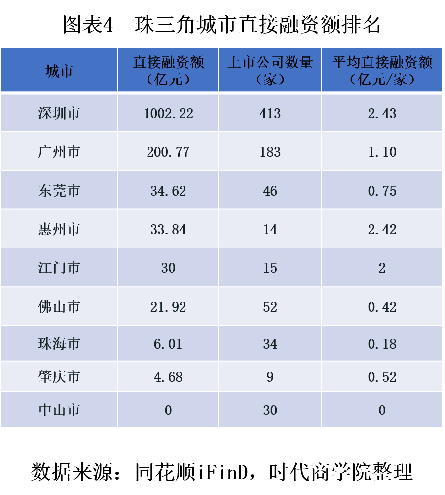 (4)资本市场活跃度高,上市公司直接融资额均值位居珠三角第2