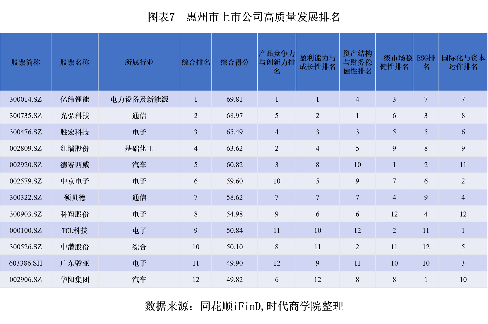 时代商学院基于财务及非财务两大维度,从产品竞争力与创新力、盈利能力与成长性、资本结构与财务稳健性、二级市场稳健性、ESG表现及国际化与资本运作能力六大指标综合分析惠州市A股上市公司的发展质量。