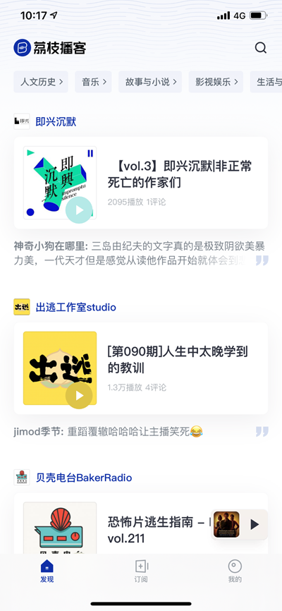 在发现页里,通过线性排列推出播客节目,用户点击后即可收听相关内容。当然,用户可以根据自身喜好,在“人文历史”、“影视娱乐”、“故事与小说”等标签内寻找心仪的播客账号。“发现”页还会根据用户收听历史每日为其推荐三个新播客节目单集。这种简洁有效的推荐方式,让初次接触播客又找不到好听节目的用户有了“选择”的可能。