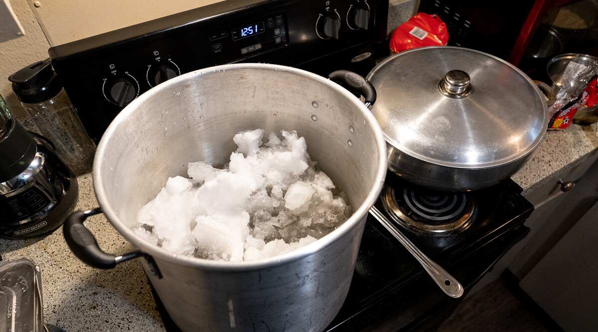 缺水的家庭只好“就地取材”从屋外取回雪熬水喝