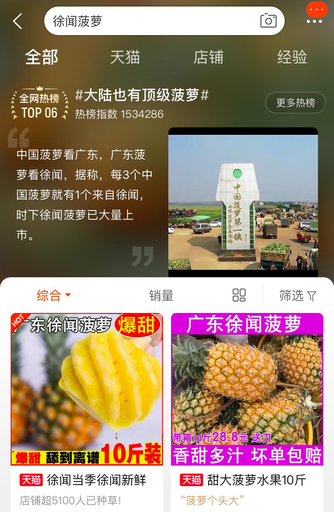 果丰价好,也让全国的采购商涌入“菠萝的海”。根据阿里巴巴平台数据显示,3月以来,“徐闻菠萝”搜索量同比去年增长10余倍,销量环比一周前增长近8倍。3月4日上午,“大陆也有顶级菠萝”站上淘宝全网热榜。