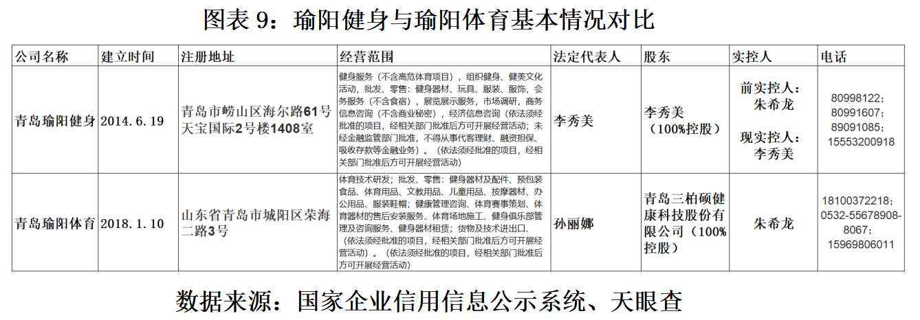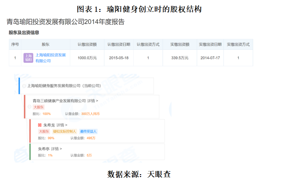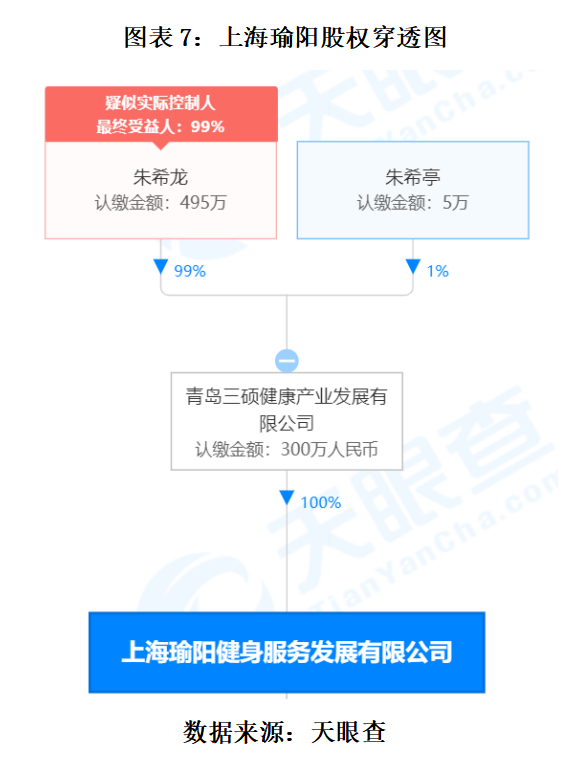 而朱希亭是朱希龙之兄,天眼查显示,2014年6月19日,青岛瑜阳投资发展有限公司创立(青岛瑜阳健身发展有限公司(以下简称“瑜阳健身”)前身),该公司实际控制人为朱希龙(间接持股99%),法人则由朱希亭担任(间接持股1%)。