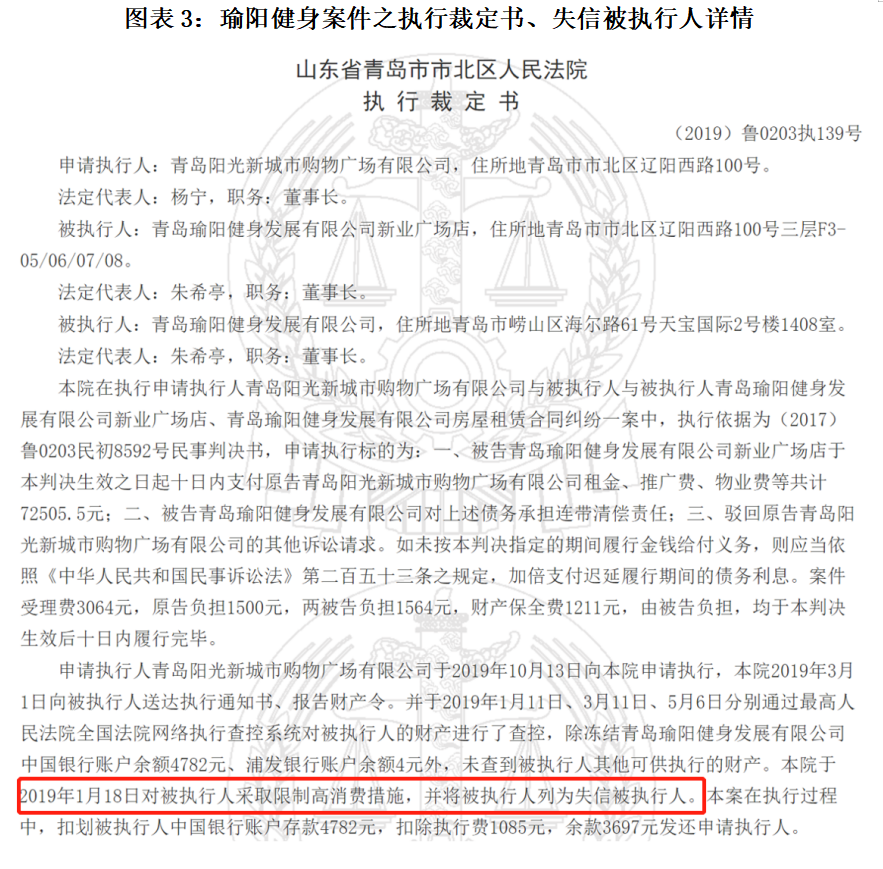 瑜阳健身要在判决生效之日起十日内支付相应金额,但该公司却拒绝履行债务。最终,据天眼查信息,在2019年1月18日,瑜阳健身由于有履行能力而拒不履行生效法律文书确定义务,被列为失信被执行人,法人朱希亭被采取限制高消费措施。也就是说,朱希亭成为了“老赖”,而实际控制瑜阳健身的三柏硕实控人朱希龙,却未被列为老赖。