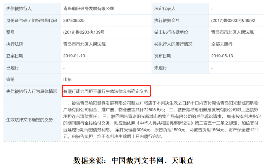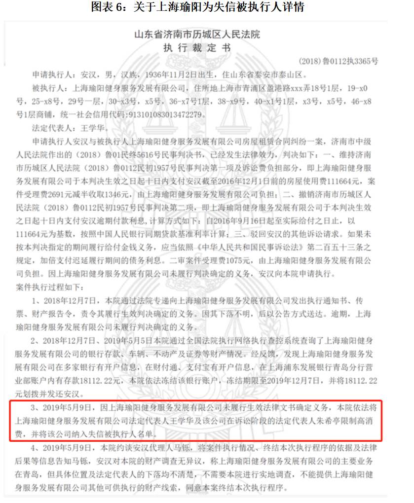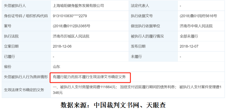 除瑜阳健身外,裁判文书网、天眼查显示,朱希龙曾控制的上海瑜阳健身服务有限公司(下称“上海瑜阳”),也同样因拖欠房租,有能力支付债务却拒不履行等原因,被列入失信名单。
