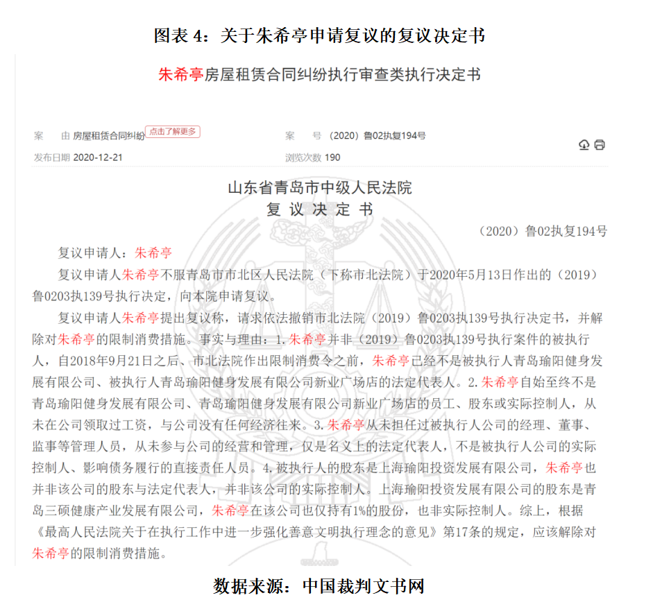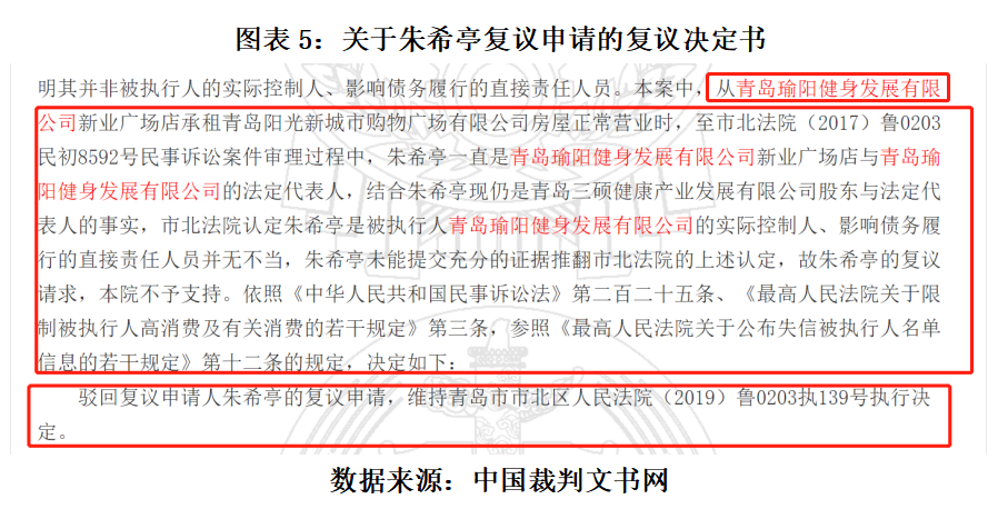 虽然此次复议申请未获法院通过,但朱希亭的复议申请也给了我们启示,作为老赖企业瑜阳健身的实际控制人(间接持有99%股份),三柏硕实控人朱希龙难道真的一点责任都没有么?不应该被列为失信人么?