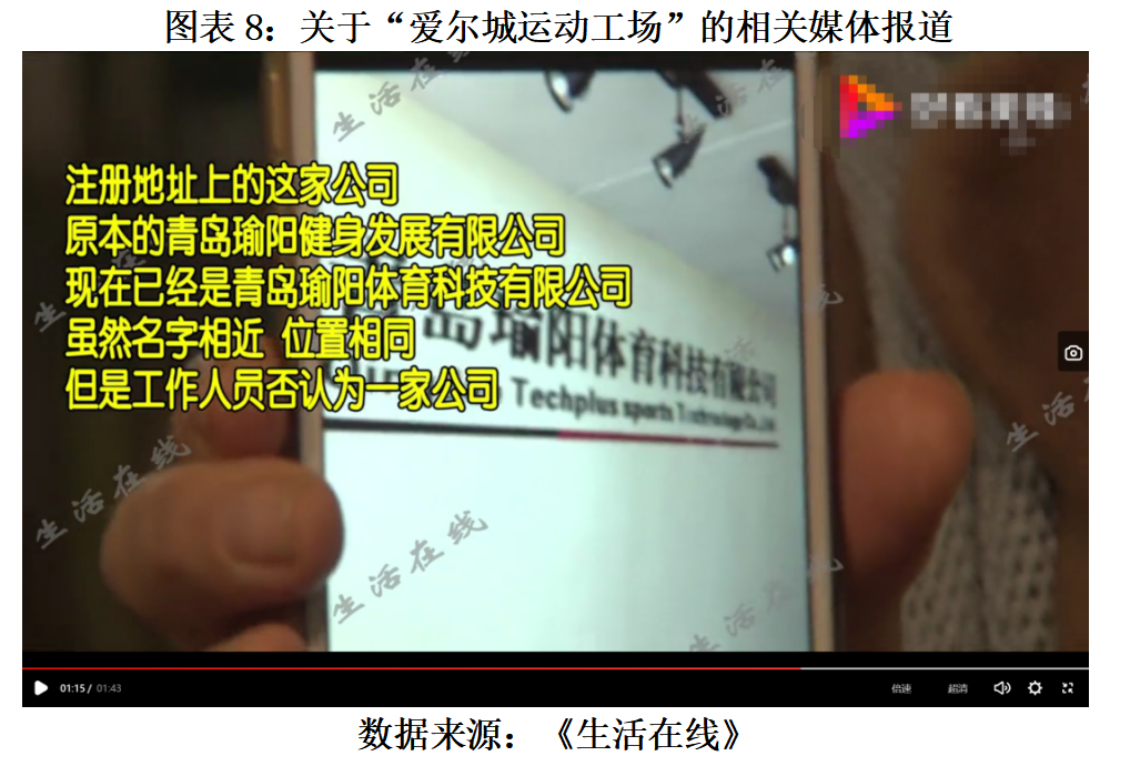 而当消费者前往瑜阳健身工商注册地“青岛市崂山区海尔路某写字楼”了解情况时,却发现公司名为“青岛瑜阳体育科技有限公司”(下称“瑜阳体育”)而非“青岛瑜阳健身发展有限公司”,瑜阳体育工作人员声称两家企业没有关系。