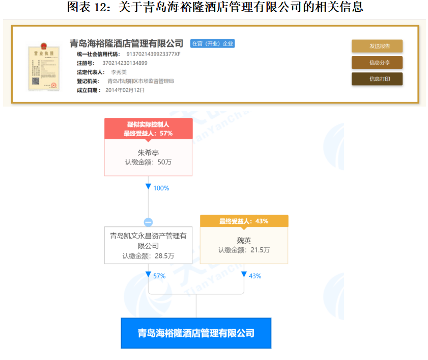 经时代商学院研究发现,李秀美同时还担任青岛海裕隆酒店管理有限公司的法人,而这家公司与朱希龙和朱希亭两兄弟都存在着联系。天眼查显示,这家公司的实控人为朱希亭。而据国家企业信用信息公示系统的资料显示,朱希龙曾担任此公司的法人。
