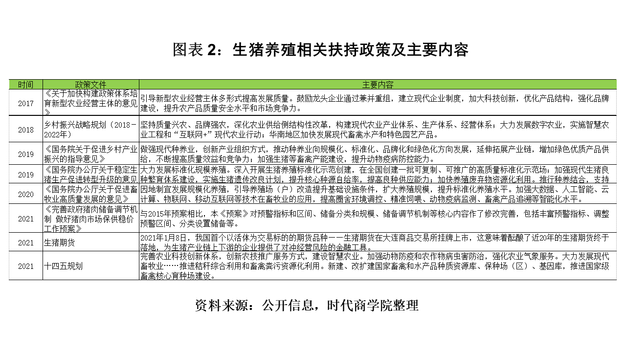三农,尤其是其中的生猪养殖行业是关系国计民生的重要行业,一直受国家重视与扶持,无论是中央一号文件、乡村振兴战略规划、“十四五”规划,还是针对畜牧业的诸多政策,均给与了生猪养殖业大力的支持。同时,为应对猪周期猪价大起大落的风险,国家正持续完善猪肉储备调节机制,平滑“猪周期”波动,并于2021年1月份推出了生猪期货,这无疑利好整个行业的发展。
