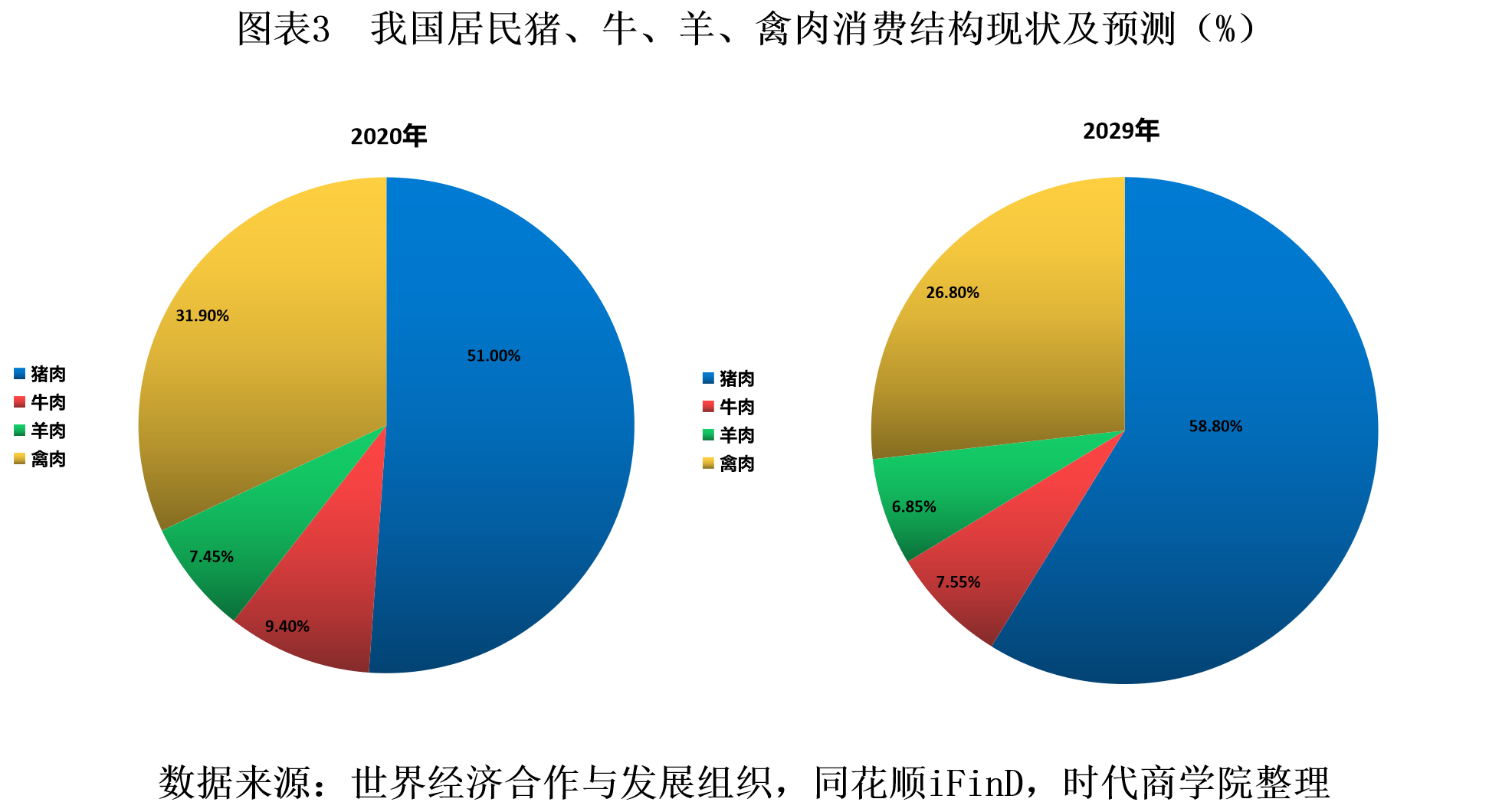 世界经济合作与发展组织的统计预测数据显示,2020年我国猪肉、牛肉、羊肉、禽肉的年人均消费量为22.72kg、4.19kg、3.31kg、14.19kg,消费结构占比为51%、9.4%、7.45%、31.9%,预计到2029年,我国猪肉、牛肉、羊肉、禽肉的人均年消费量分别为31.05kg、3.99kg、3.62kg、14.18kg,消费结构占比为58.8%、7.55%、6.85%、26.8%。