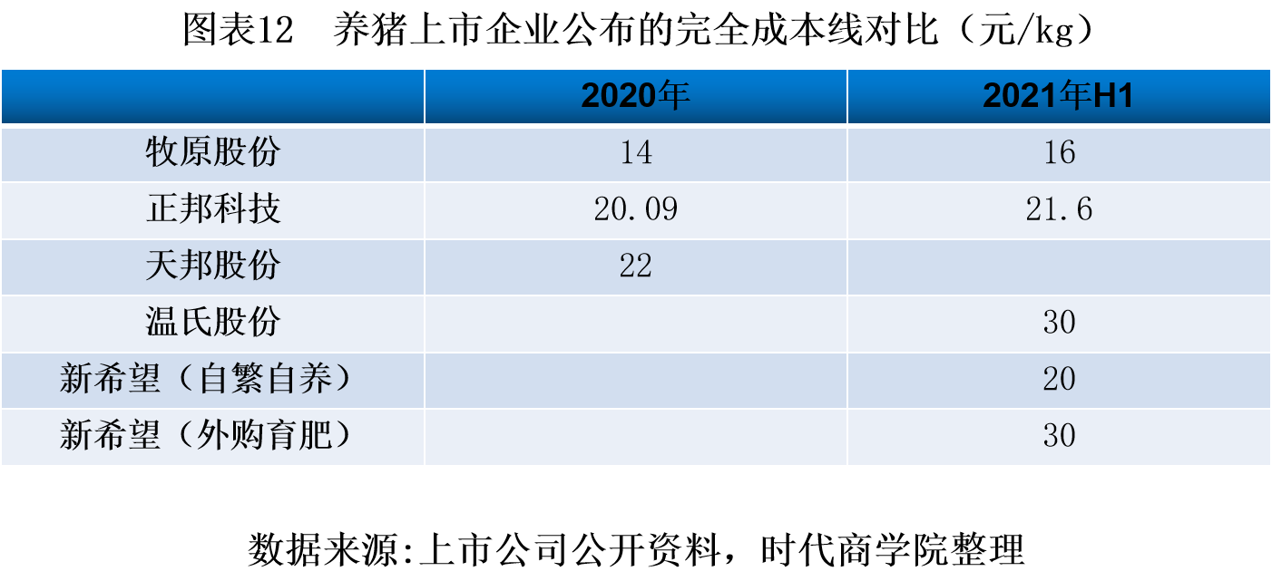 进入2021年,猪价持续下跌至部分企业的成本线以下。从2021年公布的完全成本线看,牧原股份仍然以16元/kg的完全成本线位列行业最低成本,新希望自繁自养的完全成本线为20元/kg,外购育肥的完全成本线为30元/kg,正邦科技的完全成本线为21.6元/kg,温氏股份的完全成本线为30元/kg。