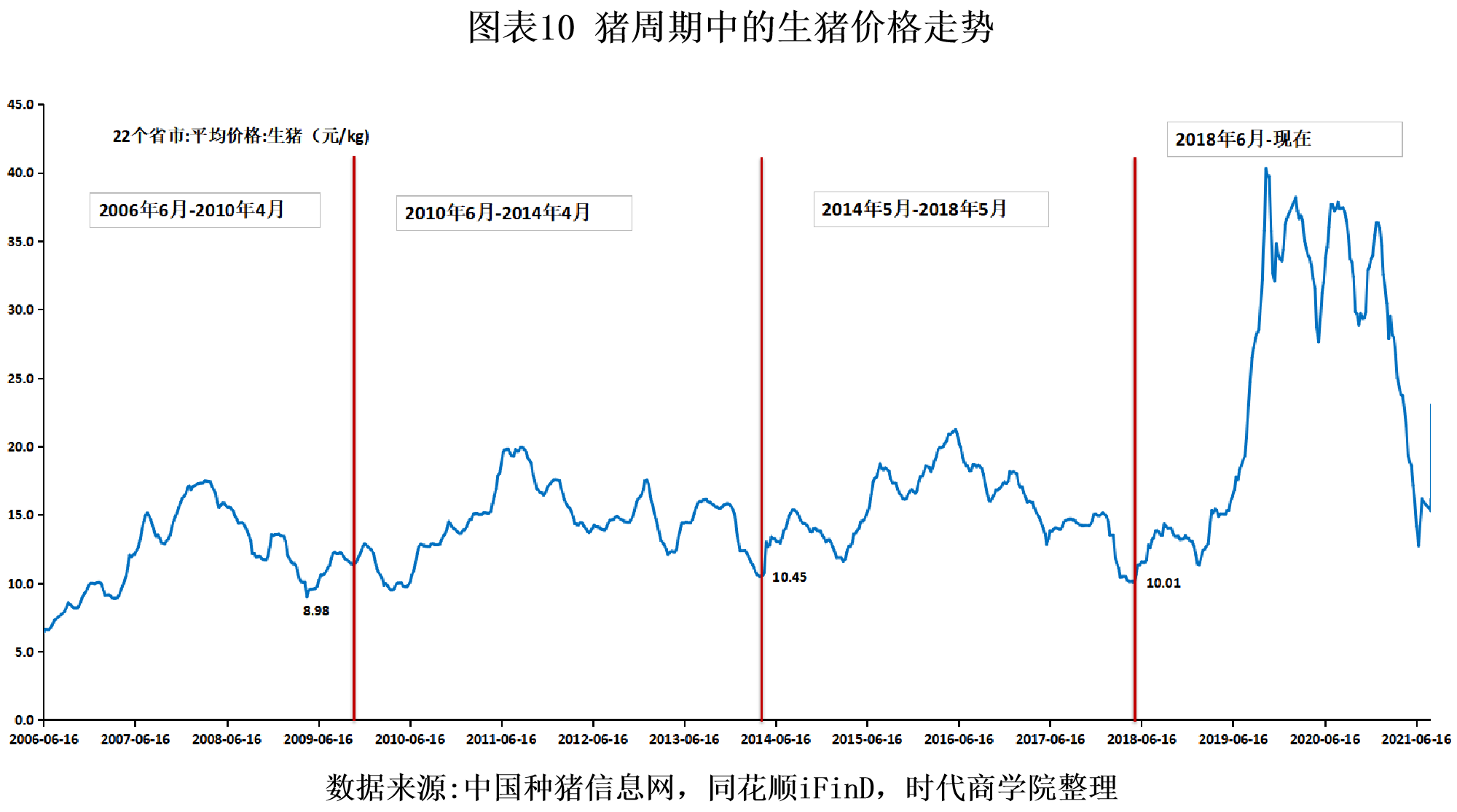 2018年中以来,在近年来严格的环保政策、规模化养殖趋势、“非洲猪瘟”等多因素的影响下,我国生猪养殖业形成了一个产能与价格波动幅度大,价格快涨快跌的猪周期。事实上,受非洲猪瘟的冲击,猪肉价格自2018年5月的10.01元/kg,一路攀升至2019年10月末的最高价40.29元/kg,一年半左右的时长,价格涨幅高达302.5%,而前面三个猪周期价格涨幅最高仅为171.7%,本轮猪周期的价格波动幅度偏大。与此同时,2019年10月,猪肉价格自最高点一路下跌至2021年6月末的12.73元/kg,8个月时长,价格跌幅达68.4%,目前,猪价自2021年6月的价格低点反弹至2021年8月6日的15.5元/kg。