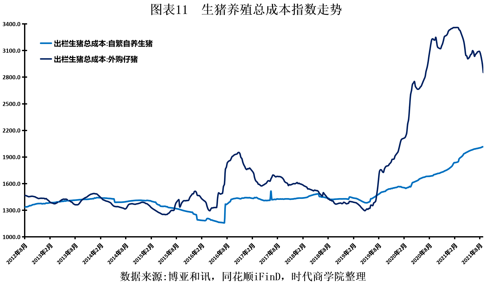 本轮猪周期中猪价何时见底?前面三轮猪周期的最低价格中,除第一个猪周期中猪价在2006年最低跌至8.98元/kg,后续两轮猪周期中猪价最低均在10元/kg以上,然而与前面三轮猪周期不同的是,生猪养殖成本随着环保投入增加、生物防控投入增加、粮食价格上涨等因素影响在不断抬升。博亚和讯数据显示,不管是自繁自养抑或是外购仔猪育肥,出栏生猪的总成本线自2019年不断抬升,创下了近10年的新高。