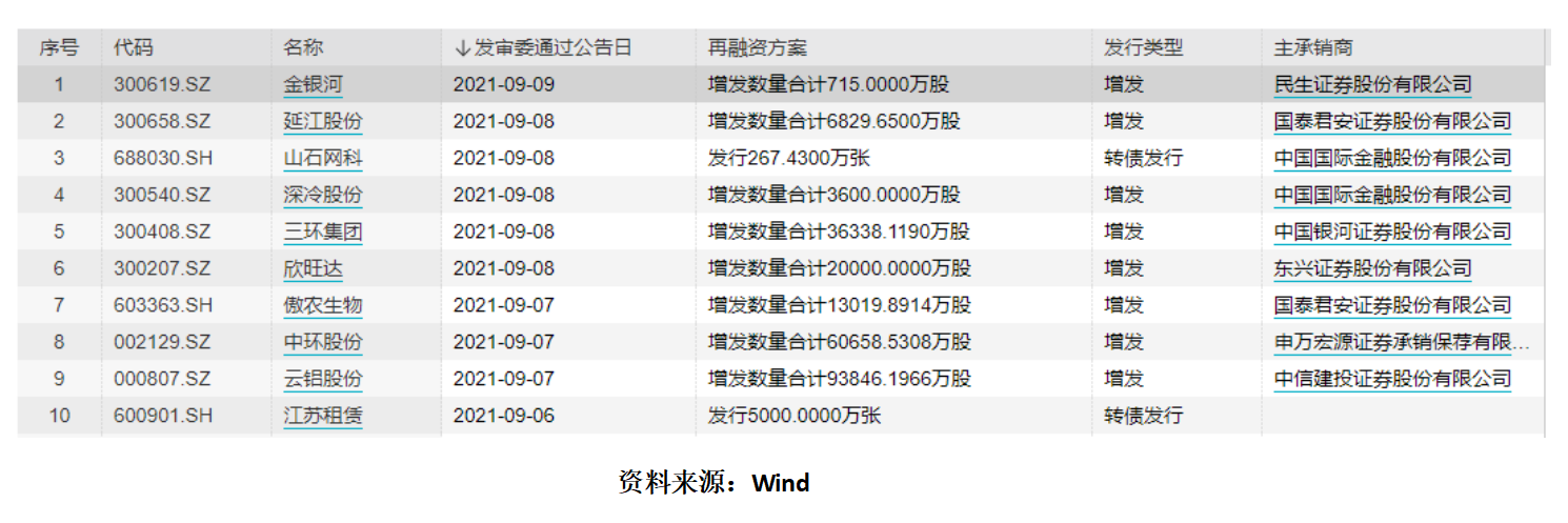 9月4日到9月9日,A股上市企业中,共有10家企业再融资审核通过,发行267.43亿张,其中8家企业为增发,2家为转债发行。这10家企业涵盖了制造业、信息技术、清洁能源、生物、工业机械等行业。