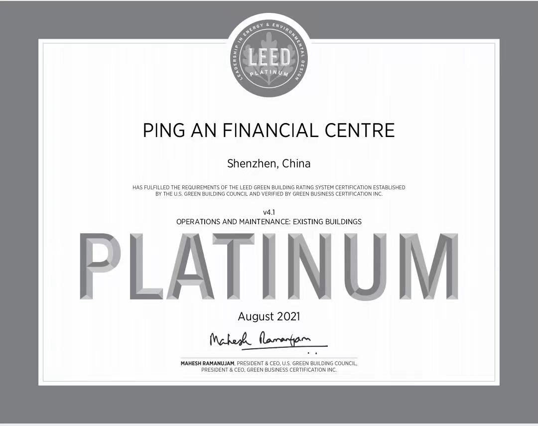 近日,“世界最高办公建筑”——深圳平安金融中心获得LEED v4.1 O+M:EB(运营与维护:既有建筑)铂金级认证、中国绿色建筑三星级认证,同时荣膺国内外绿色建筑领域的最高级别奖项,充分展现了平安金融中心作为绿色建筑典范在节能环保、可持续发展领域的出众表现,以及项目在运营维护阶段的卓越水准。