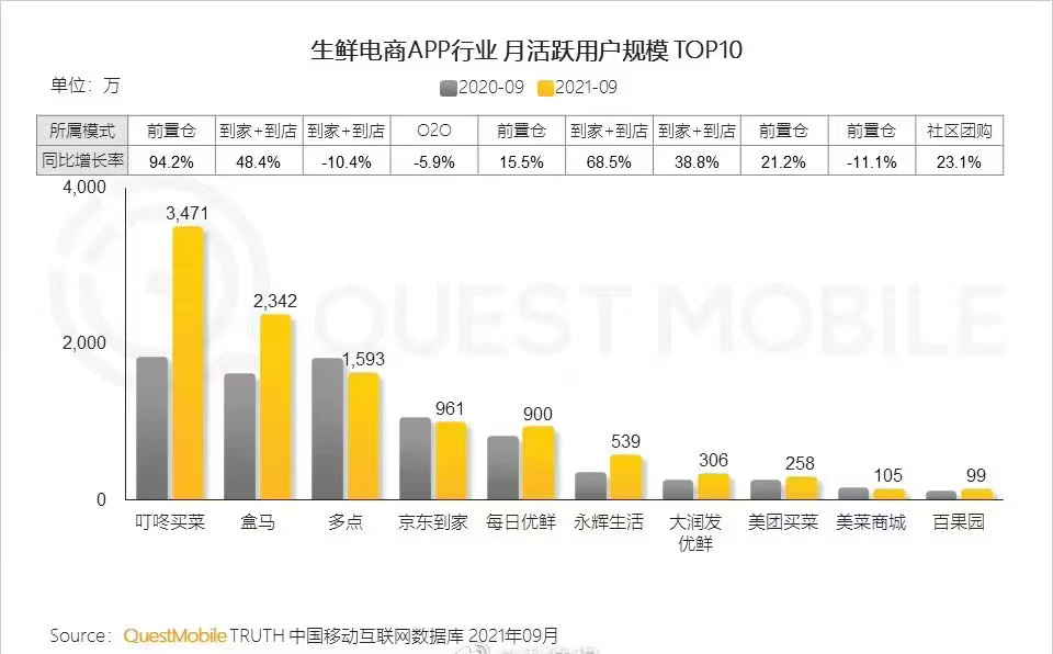 此外,根据QuestMoblie的数据,叮咚买菜2021年9月的月活跃用户数在行业APP中排名第一,表明用户对叮咚买菜有着较高的认可与忠诚度。