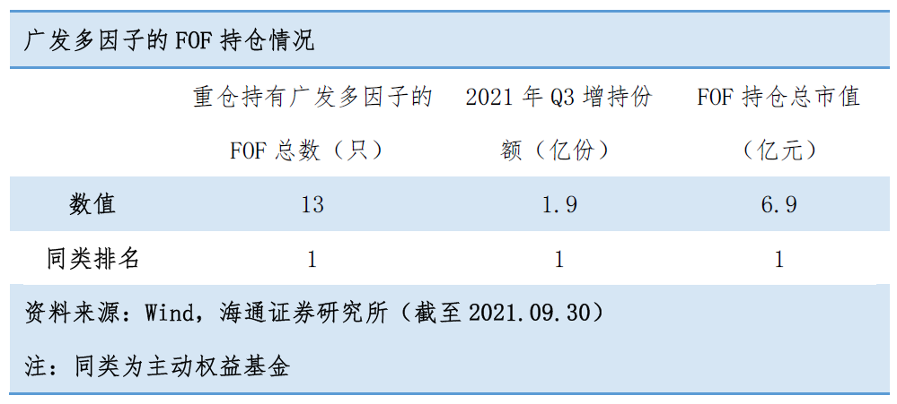 2021年三季报显示,广发多因子是三季度FOF增持份额最多的主动权益基金,共增持1.9亿份。具体来看,广发多因子已被13只FOF集中持有,是FOF持仓市值最大的主动权益基金,合计持仓6.9亿元。
