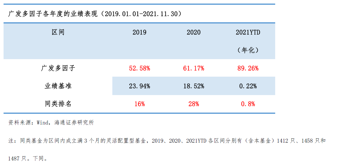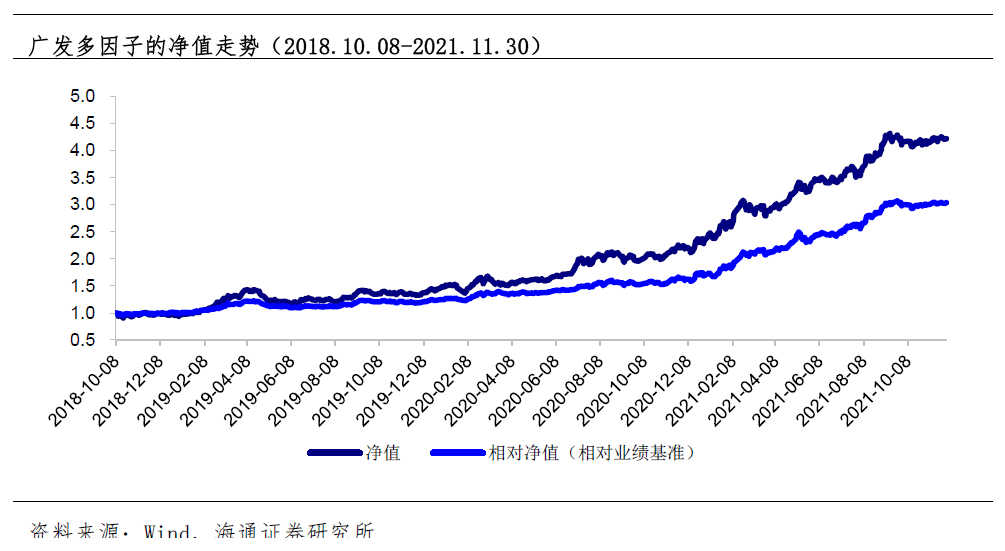 根据海通证券数据,自2018年10月以来(扣除基金经理的三个月建仓调整时间),截至2021年11月30日,广发多因子的年化收益为55.69%,相对业绩基准的年化超额为45.33%。收益在同类基金中排名前5%。