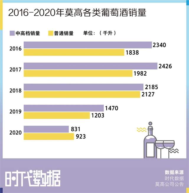 上市葡萄酒企业莫高披露的数据显示,2020年莫高中高档葡萄酒销量为831千升,同比下降43.5%;莫高普通葡萄酒销量为923千升,同比下降23.3%。