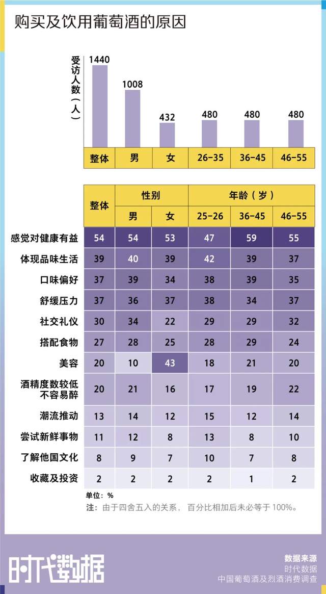 中国葡萄酒及烈酒消费调查数据显示,54%受访者表示感觉饮用葡萄酒对健康有益是他们购买及饮用葡萄酒的原因,比率为众多原因中最高。这种观念在较年长的受访者中更常见,在36—45岁及45—55岁受访者中,分别有59%及55%表示感觉饮用葡萄酒对健康有益是购买及饮用葡萄酒的原因,比率较26—35岁消费者的47%高。其他购买及饮用葡萄酒的主要原因为体现品味生活(39%)、口味偏好(37%)及舒缓压力(37%)。