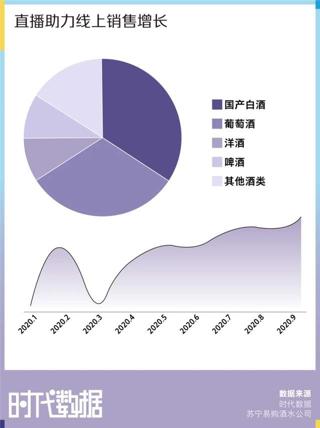 数据显示,受直播、KOL,电影电视等明星带货的影响,酒水线上直播观看人数2020年3月后呈现持续增长态势,线上酒水的市场热度居高不下。其中,葡萄酒销量市场占有率过半。