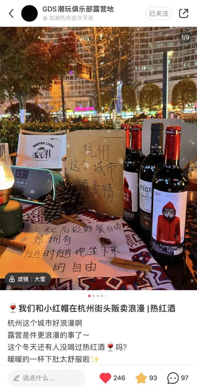 热红酒原本是欧洲圣诞节、万圣节等秋冬节日的传统热饮。进入中国市场后,热红酒主要在西式餐厅、酒吧等地出售,一直属于小众消费。2021年冬天,上海复兴西路上一家路边摊用小锅现煮热红酒,引发博主打卡,成为热红酒走红的开端。10元一杯的价格吊打奶茶和咖啡,“在最土的地方,喝最洋气的酒”,巨大的反差带来的新鲜感也吸引着年轻人们纷纷出摊。后续被其他城市的年轻人们复制,还陆续发明了“露营式热红酒”、“后备箱热红酒”等新玩法。他们一边线下“出摊”,一边在线上“种草”。