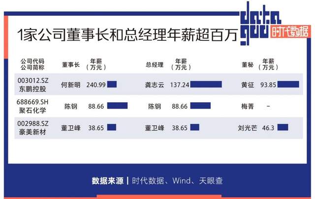 据时代数据统计,在这3家公司中,有1家公司的董事长和总经理2020年年薪超过100万元。东鹏控股(003012)董事长何新明年薪240.99万元,高居董事长年薪第一。东鹏控股(003012)总经理龚志云年薪137.24万元,位列总经理年薪第一。此外,东鹏控股(003012)董秘黄征以93.85万元年薪排在董秘年薪第一。