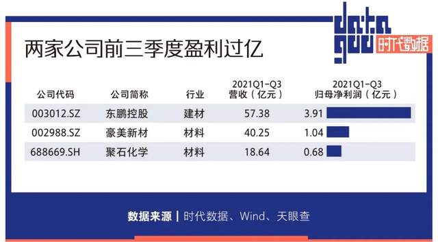 其中,东鹏控股(003012)业绩遥遥领先,前三季度营收57.38亿元、归母净利润3.91亿元。其后,豪美新材(002988)前三季度营收40.25亿元、归母净利润1.04亿元,位居第二;聚石化学(688669)前三季度营收18.64亿元、归母净利润0.68亿元,位居第三。