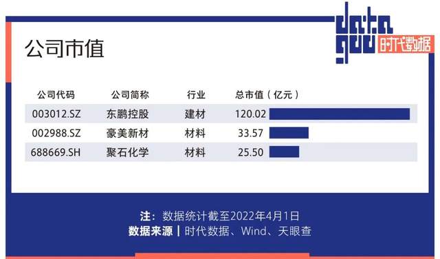 据时代数据统计,截至2022年4月1日,这3家上市公司中已有1家公司市值突破100亿元,为东鹏控股(003012),市值达到120.02亿元。