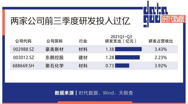 在研发投入方面,这3家上市公司2021年前三季度平均研发投入为1.13亿元。其中,豪美新材(002988)研发投入居首,为1.38亿元,占前三季度营收的3.43%;其后,东鹏控股(003012)研发投入为1.28亿元,占前三季度营收的2.23%,位居第二。此外,聚石化学(688669)研发投入0.73亿元,占前三季度营收的3.92%。