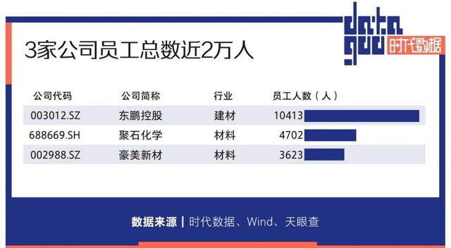 据时代数据统计,这3家上市公司的员工总数为1.87万人,创造就业岗位近2万个。其中,东鹏控股(003012)创造的就业岗位雄踞第一,拥有员工约1.04万人;其后,聚石化学(688669)拥有员工4702人,排在第二;豪美新材(002988)拥有员工3623人,排在第三。