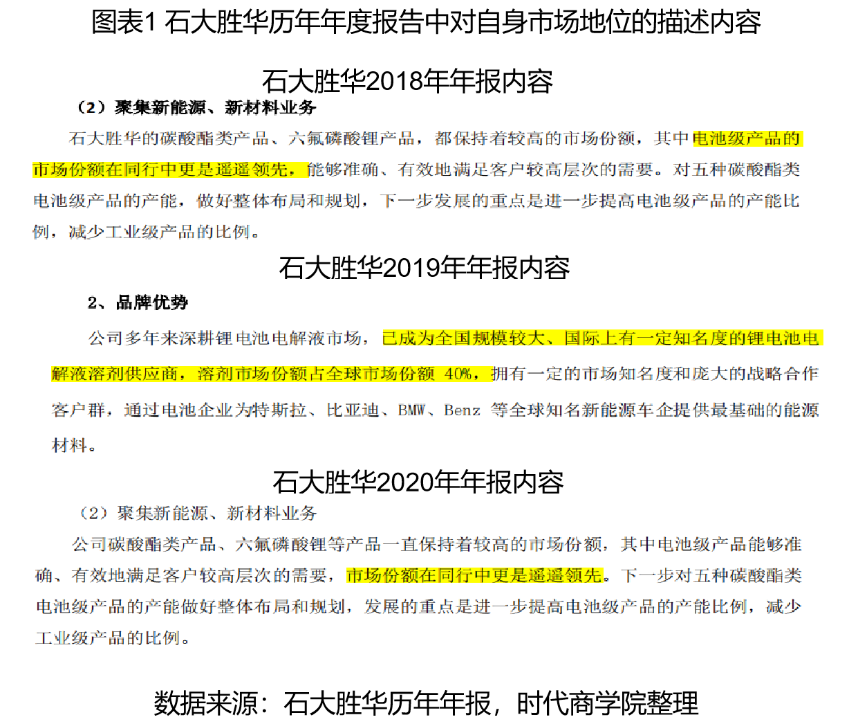 这也与石大胜华在历年年报中对自身市场地位的描述内容不相符合。石大胜华在2018-2020年的年报中明确表示,公司旗下碳酸酯类产品一直保持着较高的市场份额,其中电池级产品的市场份额在同行中更是遥遥领先。石大胜华2019年的年报显示,该公司已成为全国规模最大的锂电池电解液溶剂供应商,溶剂市场份额占全球市场份额的比例为40%。