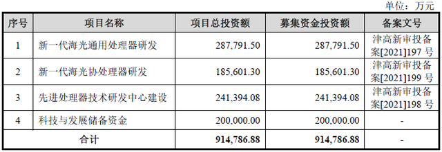 据招股书显示,海光信息此次IPO拟募集资金约91.48亿元用于3个项目的建设及储备资金,其中,拟将20亿元用于科技与发展储备资金,占拟募集资金的21.86%。