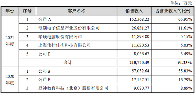 据招股书披露,公司主要客户为国内的服务器厂商。2019年至2021年,公司向前五大客户的销售收入金额分别达到3.76亿元、9.42亿元、21.08亿元,占营业收入比例分别为99.12%、92.21%和91.23%。