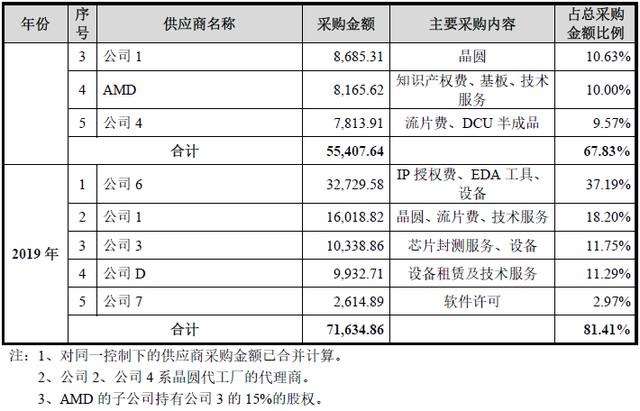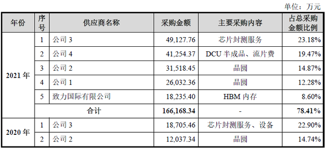 报告期内,海光信息供应商包括IP授权厂商、EDA工具厂商、晶圆制造厂和封装测试厂等,公司向前五大供应商采购金额合计分别为7.16亿元、5.54亿元、16.62亿元,占当期采购总额的比为81.41%、67.83%、78.41%,供应商集中度较高。