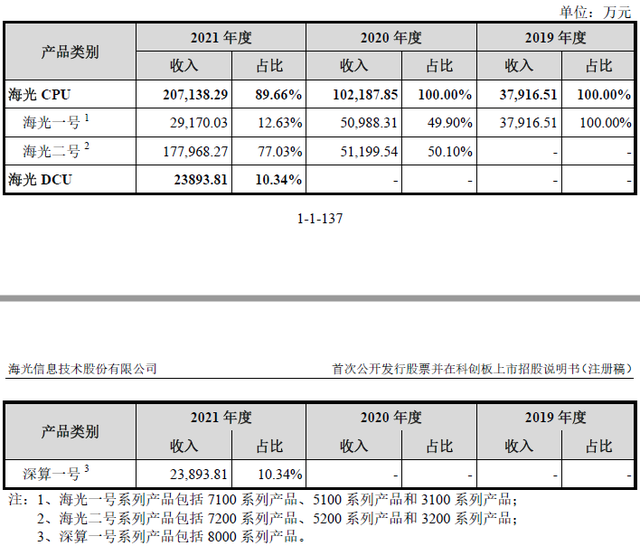 据招股书(注册稿)披露,海光信息成立于2014年10月24日,主营业务是研发、设计和销售应用于服务器、工作站等计算、存储设备中的高端处理器,产品包括海光通用处理器(CPU)和海光协处理器(DCU)。