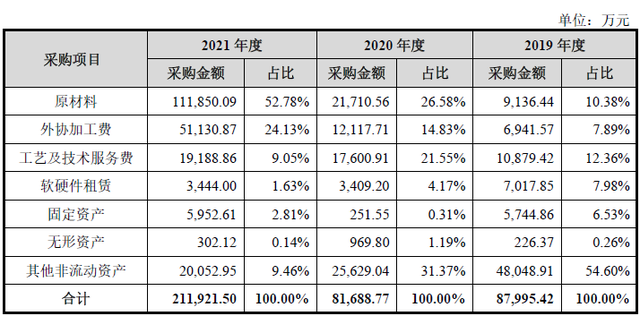 随着2021 年全球集成电路领域原材料供应紧张,晶圆和基板等原材料的价格有所上涨,公司原材料的采购金额和占比迅速升高,从2019年9136.44万元猛增至2021年的11.19亿元,占比从10.38%升至52.78%。