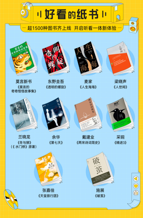 今年喜马拉雅423听书节,喜马拉雅共联合30多家出版机构,上线超1500种纸书,升级听书、买书的一站式服务,带来听看一体的全方位内容服务。除了《莫言的奇奇怪怪故事集》,东野圭吾最新推理力作《透明的螺旋》的纸书和有声书均在喜马拉雅423听书节期间同步首发。麦家《人生海海》精品有声剧和《戴建业诗词课》(书名《两宋诗词简史》)的纸书也同步上线喜马拉雅,听众可以在专辑页点击“店铺”或直接进入喜马商城购买。